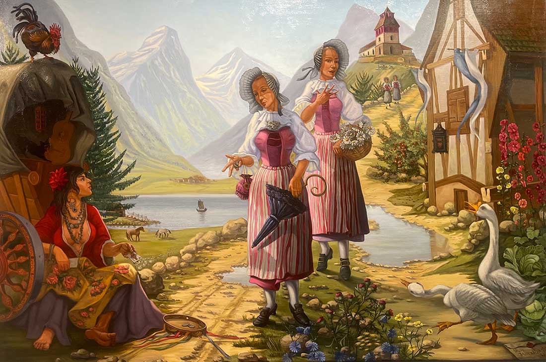 Combining traditional motifs with a strong awareness of academic painting, he creates harmony between the past and the present. Trotsky works with oil on canvas, tempera, and mixed media. He also incorporates his experiments with color design to further develop his artistic vision.
