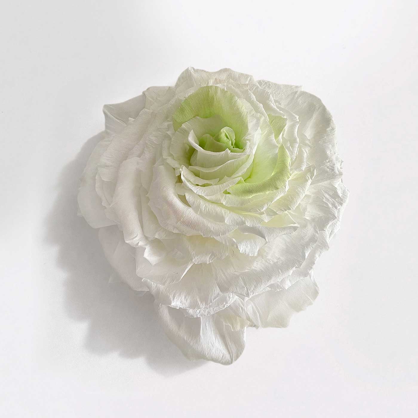 Made from fine Italian crepe paper, the 'DIOR ESSENCE' rose pays homage to legendary fashion designer and perfumer Christian Dior. Giovanna Molinari-Casile reinterpreted the rose, which became the source of countless iconic perfumes for Dior. She drew inspiration from a historic vintage book. The rose stands for timeless elegance, the art of fragrance and aesthetics.