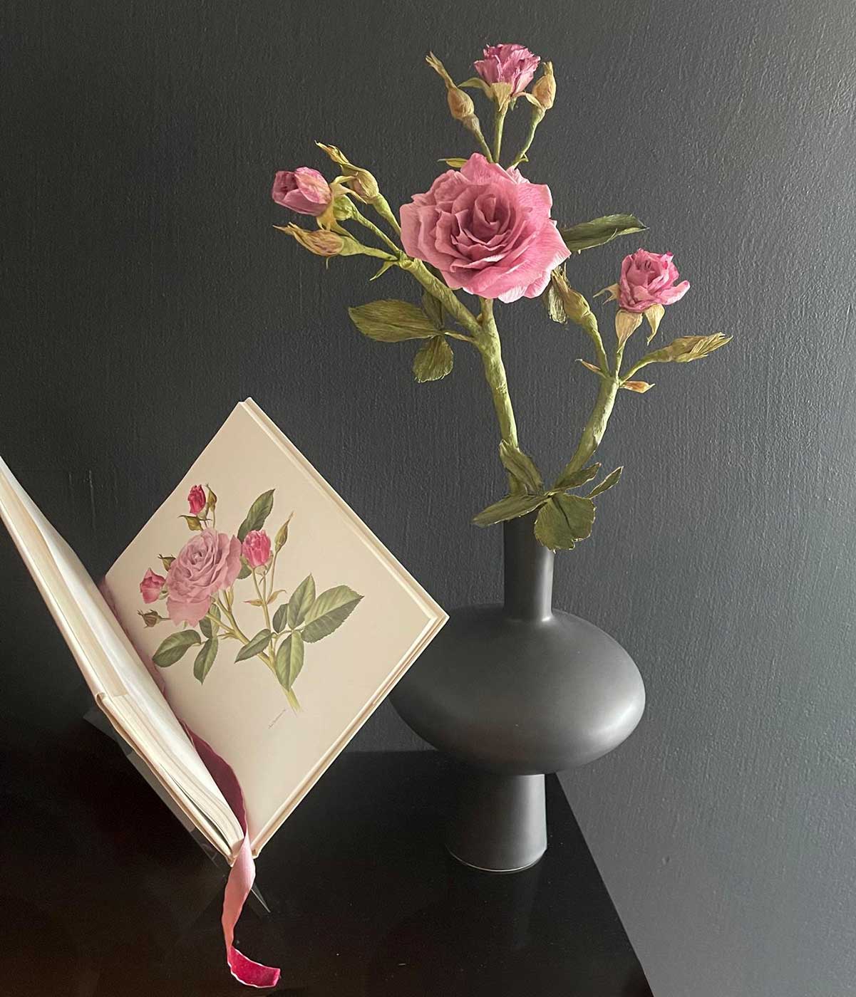 Her art, which is strongly influenced by Japanese and Asian aesthetics, celebrates her love of detail and quiet beauty. Her works, created using fine paper, capture the beauty, irregularity and fragility of flora and fauna. The transience of flowers and animals with symbolic meaning, in particular, gives her motifs an ethereal, hyper-realistic presence.
