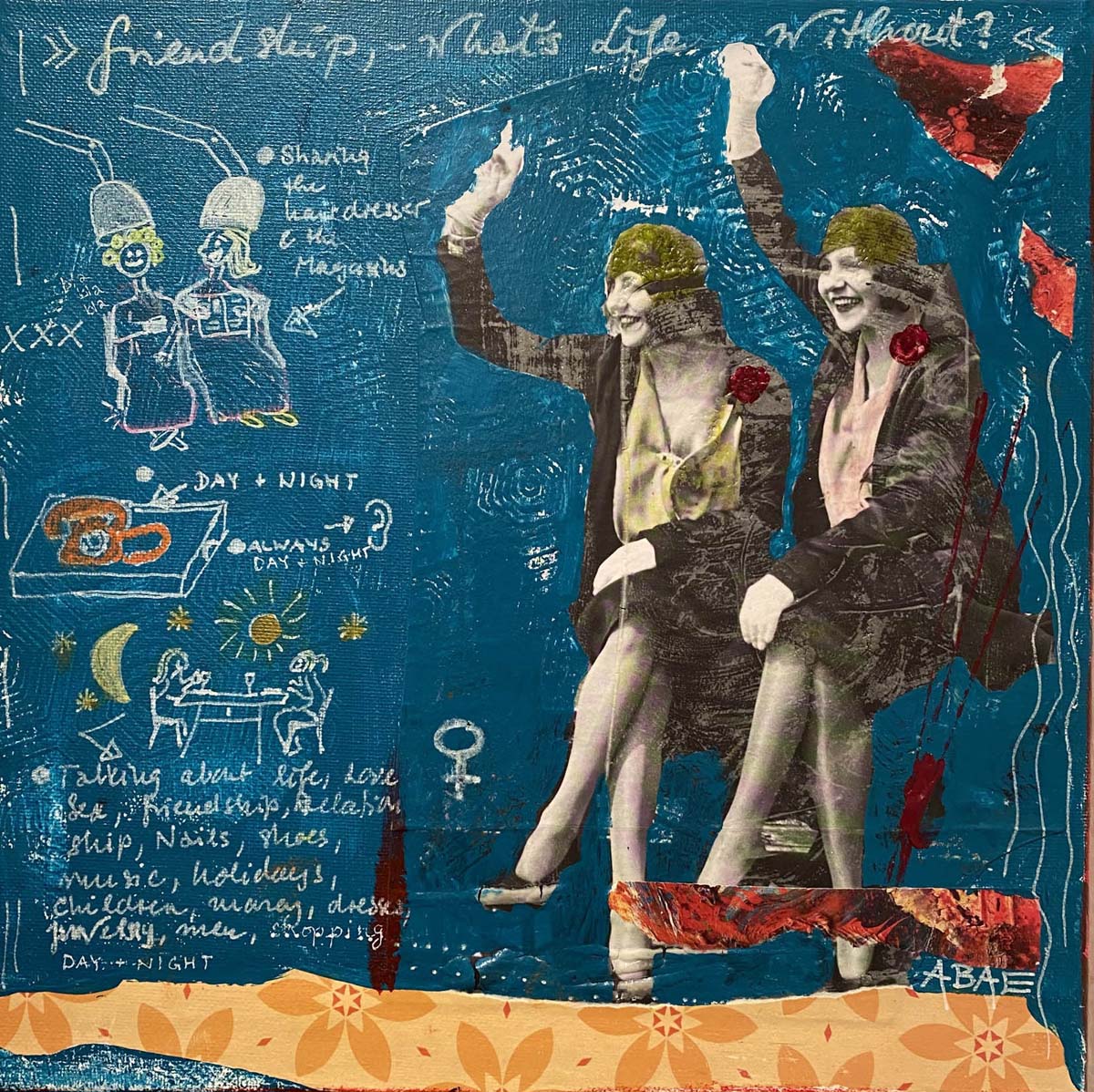 « What began by drawing comics has expanded into an intensive exploration of various acrylic painting and collage techniques. Astrid Baenziger's works are partly figuratively clear motifs, partly abstract painting. Sometimes they are exploding flower gardens, nostalgic clotheslines, paintings with poetic or political text content or stories that she wants to tell the viewer.