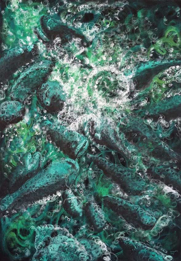 Since 2018, he has continuously used this technique in varying degrees of intensity. Donegel' Chong is inspired by Francis Bacon and Yayoi Kusama, Cy Twombly and Egon Schiele. At Art International Zurich 2021, he will present the continuation of his FEEDING series.
