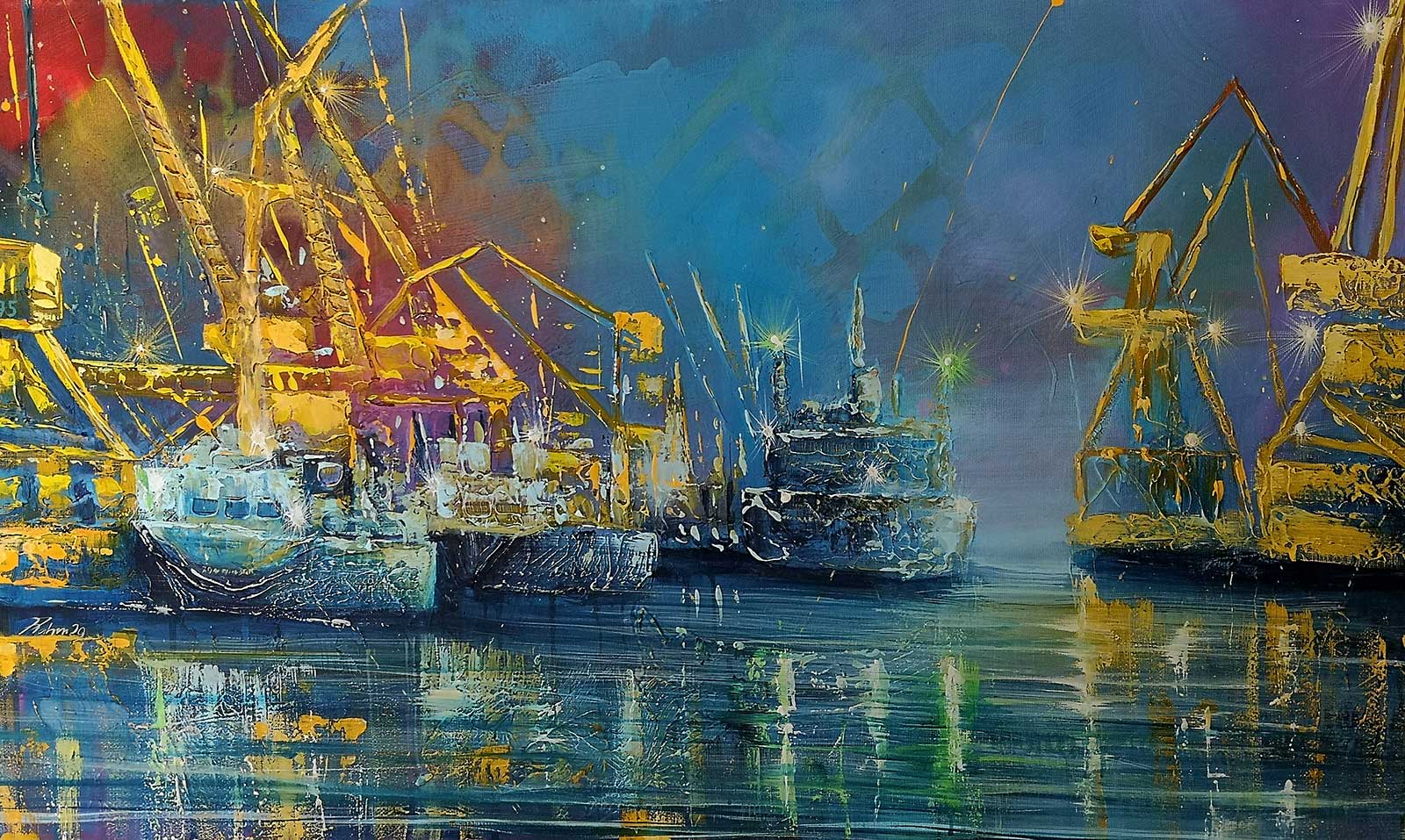 With the maritime light of the far north, Frahm brings the vibrant harbours of the world to canvas in clear and strong colours. Some works are textured, with ridges and cracks adding expression and drama. Others are more realistic, with rust effects brought to the canvas using chemical aids.