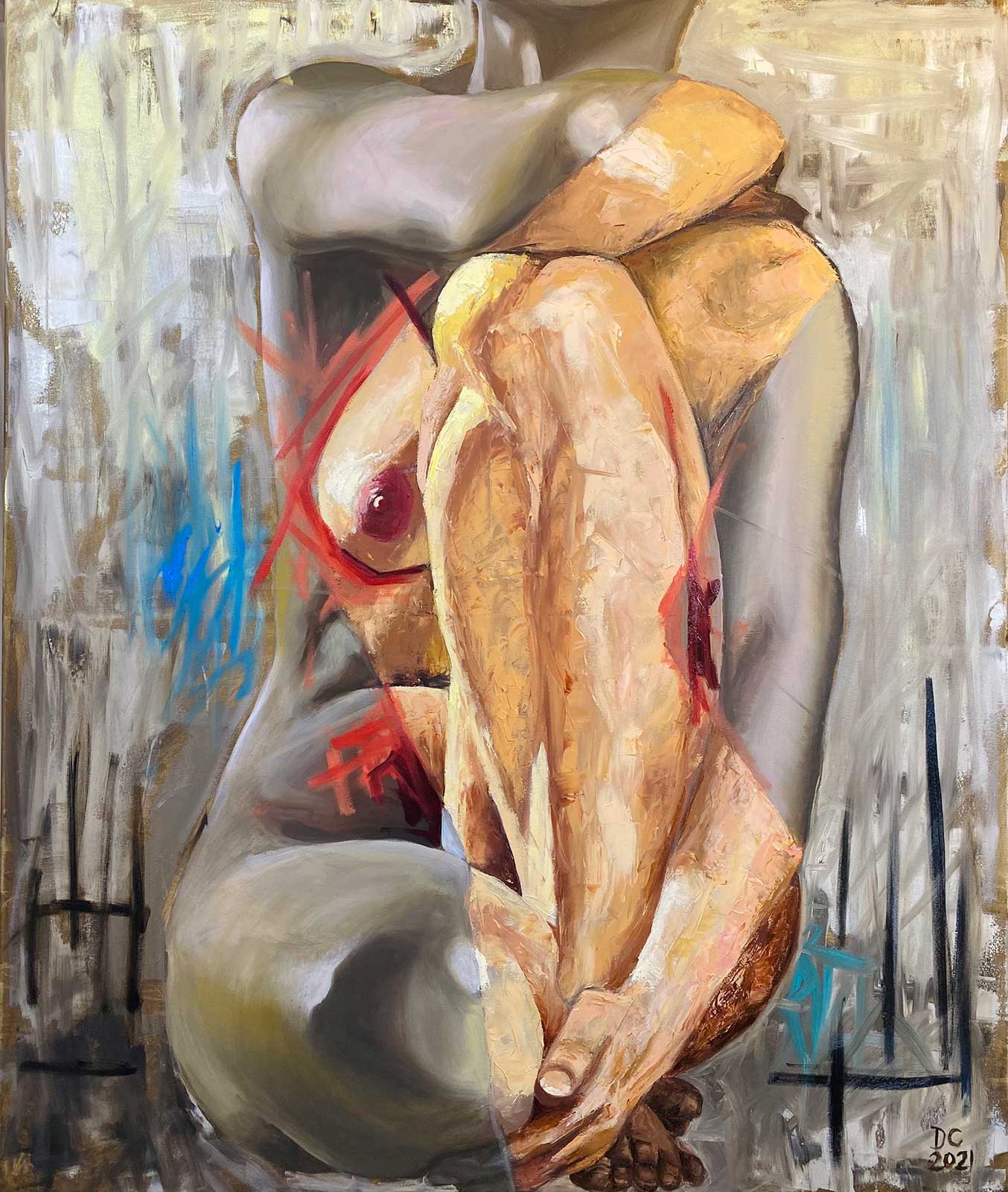 Danielle Creme uses a modern, abstract, realistic style to explore the strength and vulnerability that people strive for and struggle with. Often themes of femininity and identity are explored, as well as loss, loneliness and indecision. The idea of duality, being torn apart and the deep emotional struggles that result are expressed through contrasts in choice of colour, texture and composition.