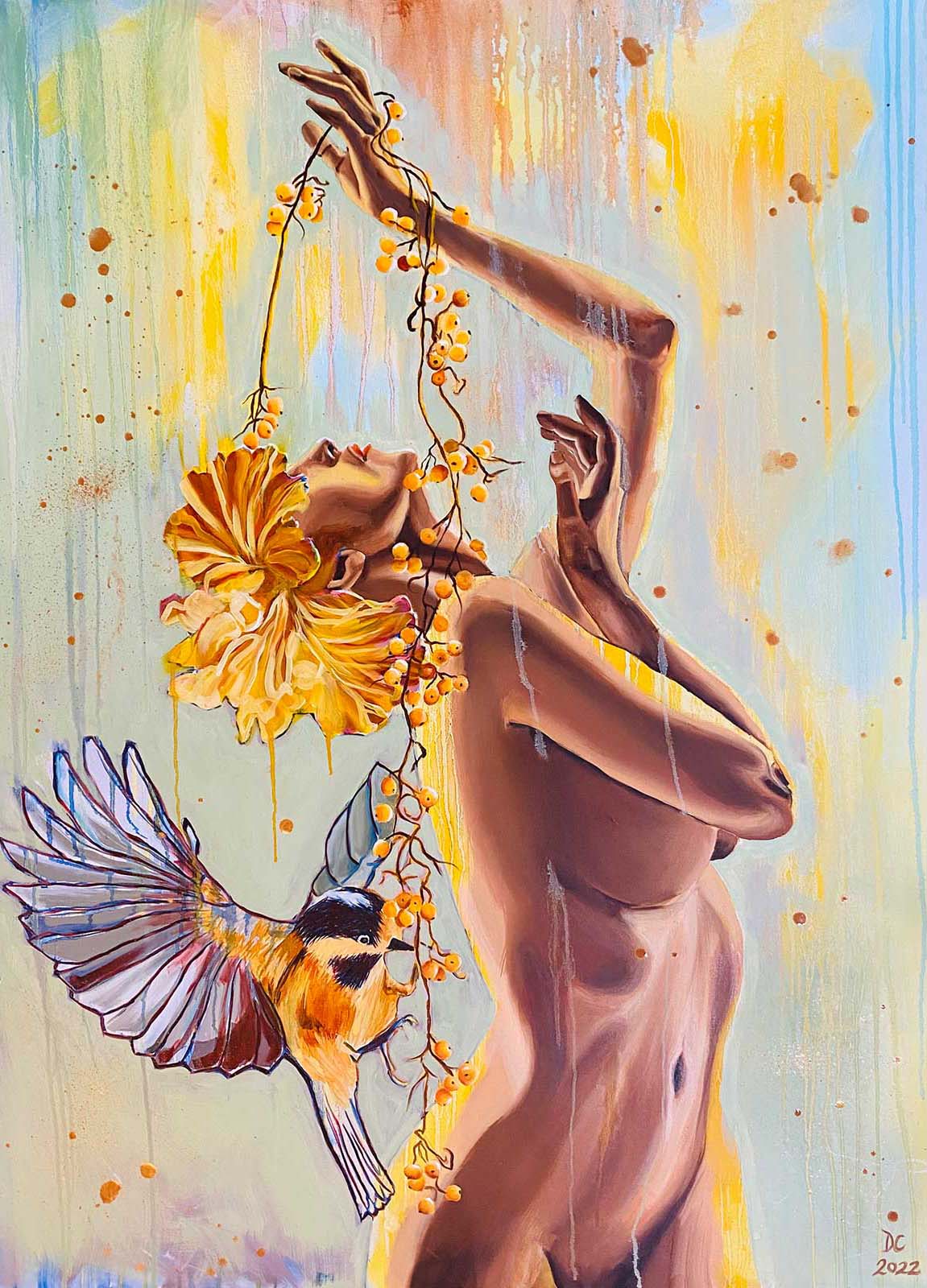 The third in the series exploring self-awareness is this painting in which the connection to self is echoed through the connection to nature. The recurring imagery of wings and flight, the ripe, berry-laden vines intertwining the figure's hands, and the upward, skyward pose all suggest a joy and celebration of being. The gaze is no longer directed at another or at oneself, but at a union with nature and the dissolution of boundaries between the physical and the spiritual.