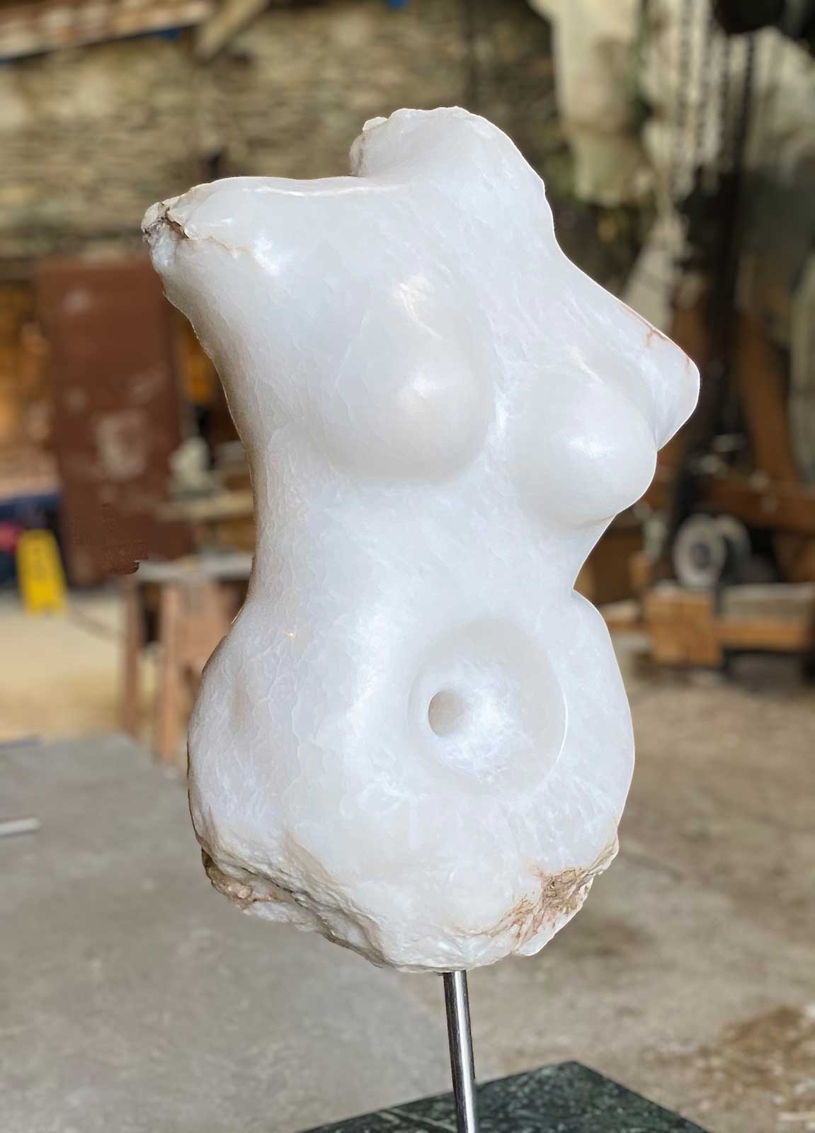 Danielle Creme: Torso I / White Alabaster on Serpentine stand, 66x24x11cm, 66kg, 2023