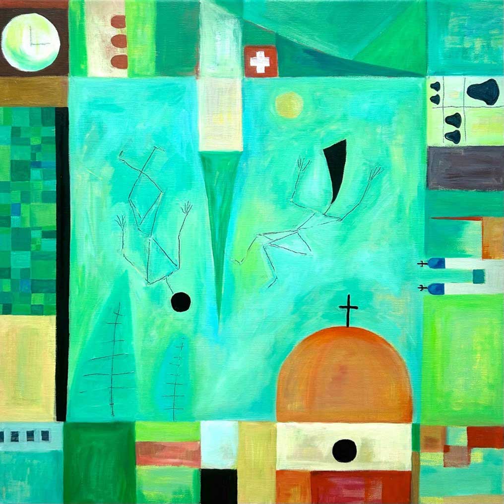 This artwork represents a dream of the artist. The centre of the painting, which is painted in blue and green, represents the sky and nature. It shows two figures ascending into the sky. The surroundings of the picture are characterised by buildings, mountains and green landscapes. In this dream, Ying Handler experiences what life is like as an immigrant in a new country and a new culture. Aspects such as newness, curiosity, fear and rootlessness are thematised. The floating movements of the figures and the deconstructed buildings in the work reflect the surrealistic feeling of the dream.