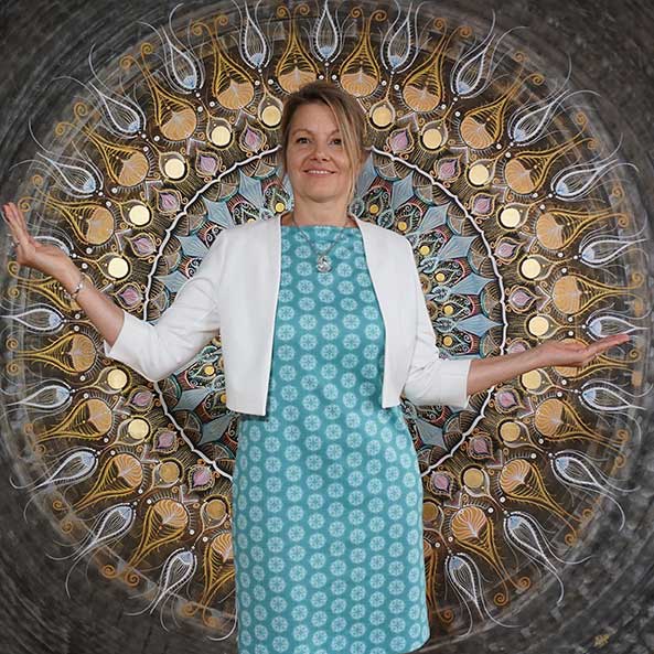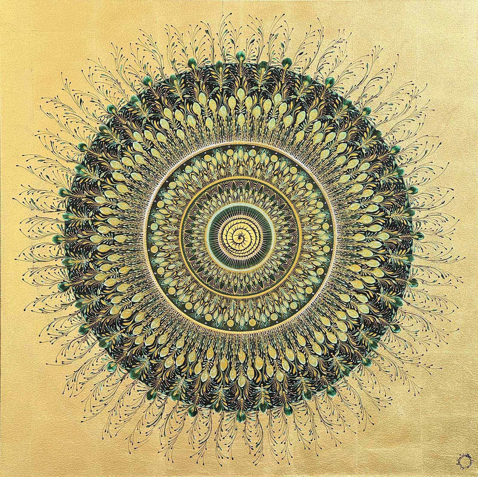 Martina Schiffer's artistic journey began in 2008 with mandalas, and since 2018 she has been working with gold leaf and metal. With the GoldArt series, Schiffer presents works made of beaten metal or gold leaf on square and round canvases.