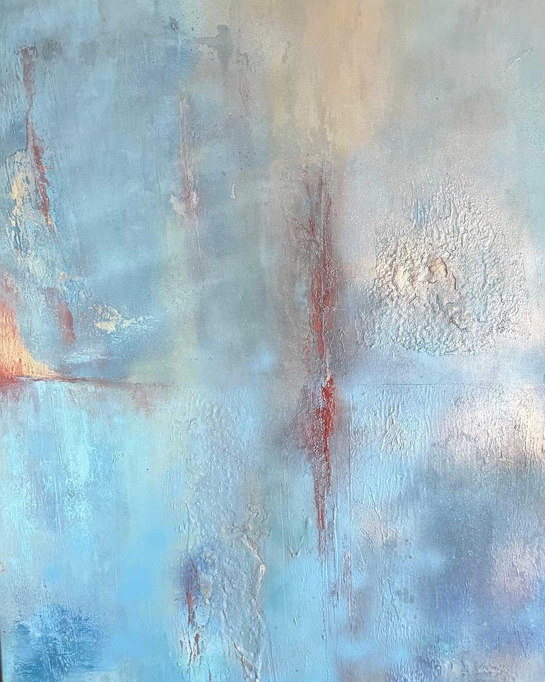 Before dedicating herself fully to painting, Khau Ny worked as a teacher in France and studied psychology—foundations that continue to inform her artistic language. Her subsequent academic training in the visual arts, combined with formative exchanges with established artists, shaped a practice that is both technically refined and conceptually grounded. Materiality lies at the core of her work. Employing cellulose, minerals, sand, epoxy resin, textured paste, and bistre, she constructs layered surfaces in which texture becomes a carrier of emotional resonance.