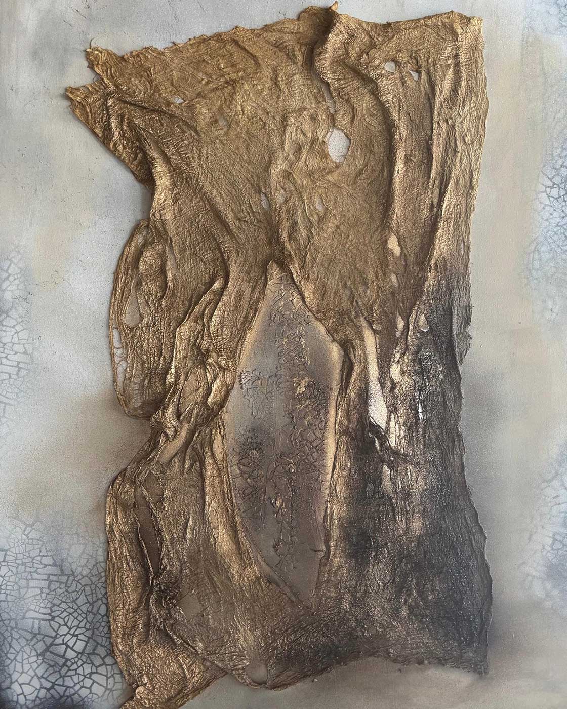 The work 'Trésor intérieur' combines Easy Structure and embedded plant fibres to create a sculptural relief surface. This is layered with acrylic paints containing matte and metallic pigments, and finished with waxes and patinas to enhance the depth and texture, giving it an aged patina effect.